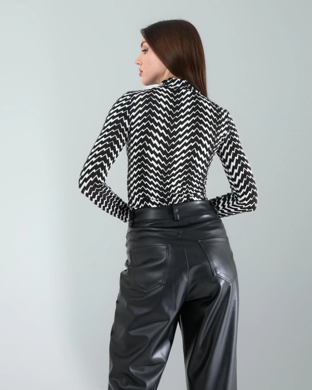Günlük Şıklık: Siyah beyaz geometrik desenli body’yi, yüksek bel siyah skinny jean ve beyaz spor ayakkabılarla kombinleyin. Üzerine siyah deri ceket ekleyerek tamamlayabilirsiniz.