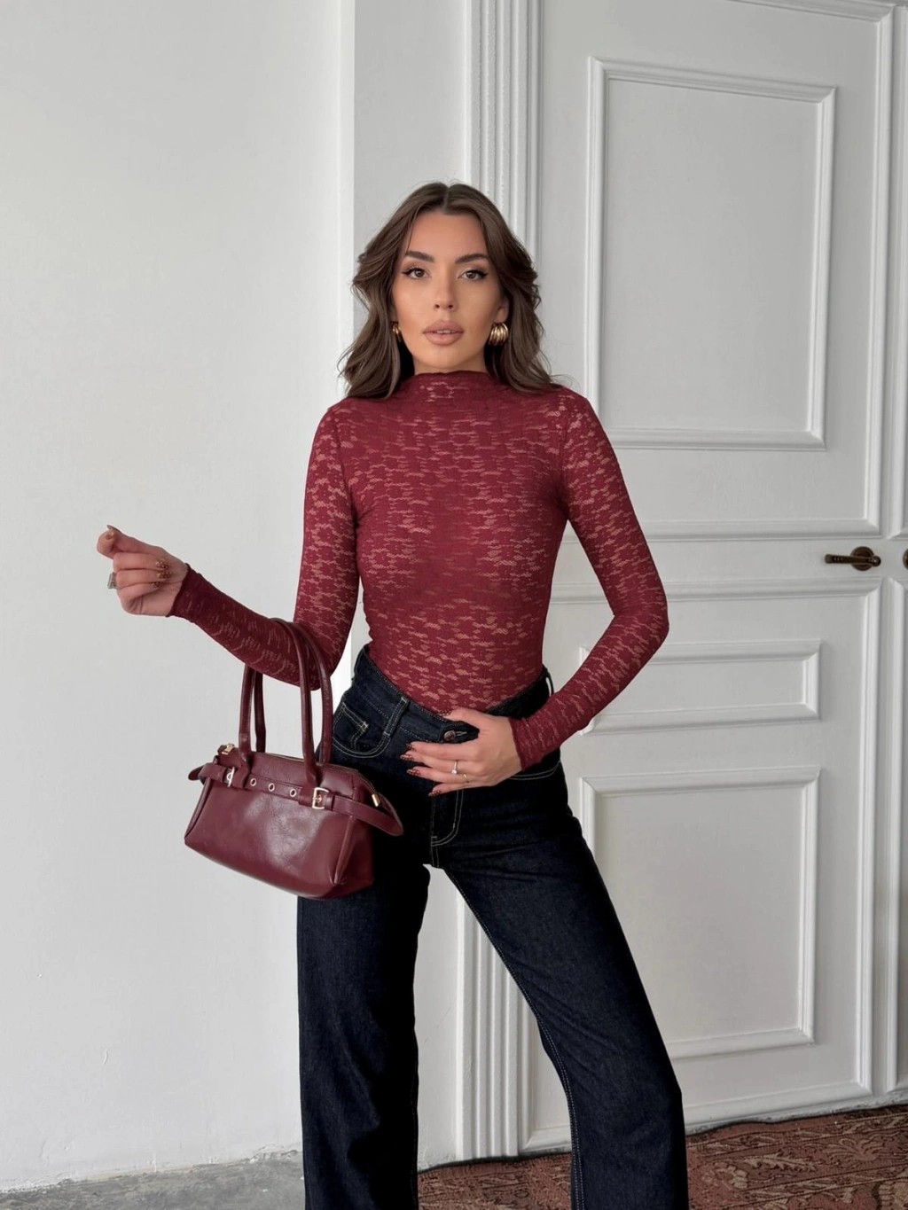 Cesur ve feminen tarzı bir araya getiren kırmızı dantel detay body, dikkat çekici ve iddialı kombinler oluşturmak isteyen kadınlar için tasarlanmıştır. Dantel dokusu sayesinde zarif bir görünüm sunarken, vücuda oturan kalıbı ile silueti etkileyici şekilde vurgular.